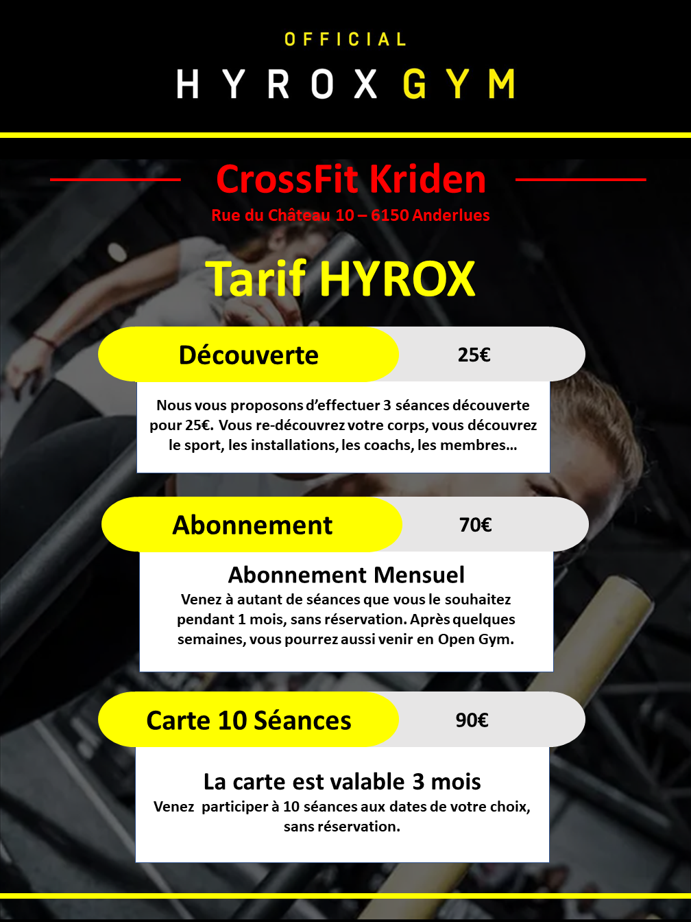 Il n’est pas nécessaire de participer à une séance “découverte CrossFit” avant de participer aux cours HYROX. Ceux-ci sont accessibles à toutes et tous, peu importe votre niveau.
